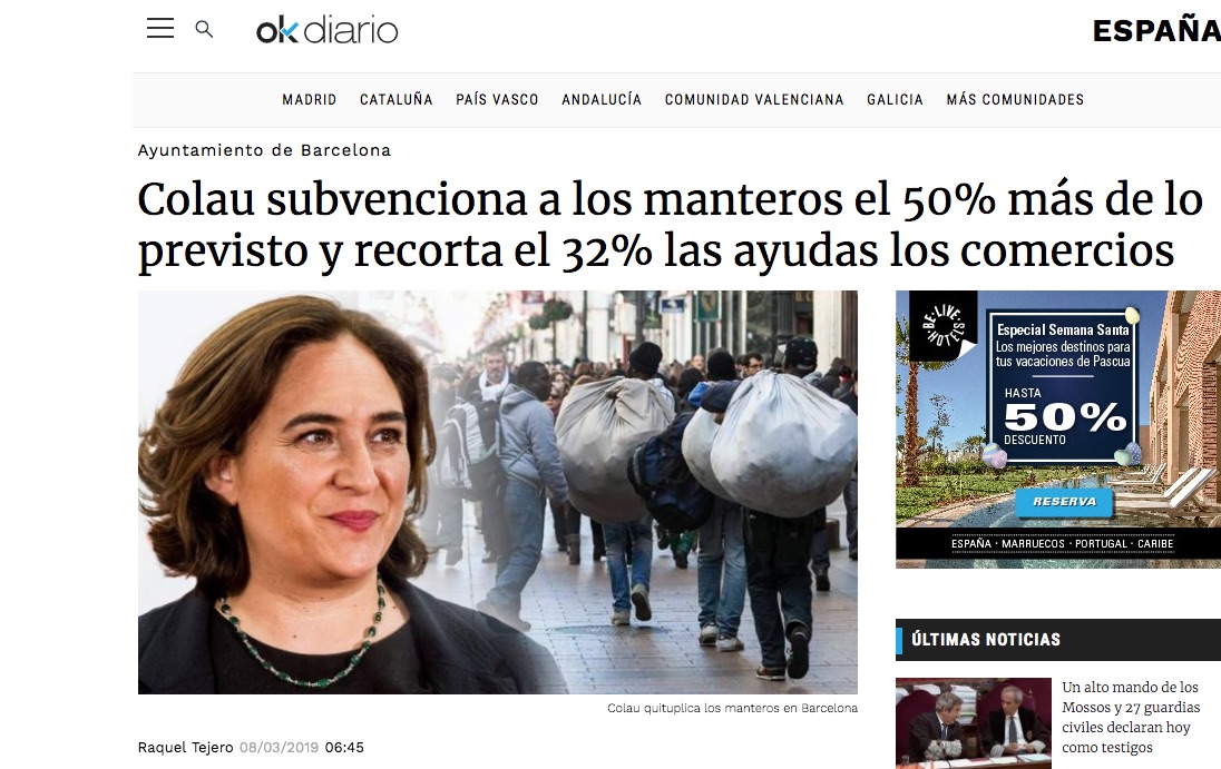 El diari electrònic OK Diario denuncia en un article molt viralitzat un augment del 50% de la subvenció del govern d’Ada Colau “als manters”.