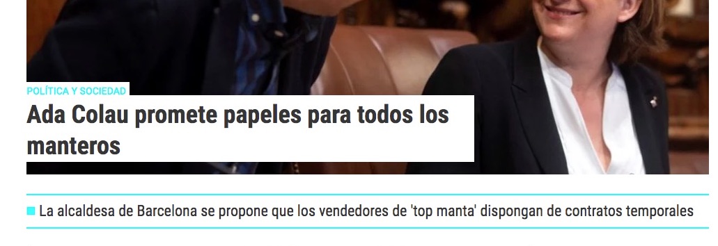 La web Economía Digital titula un article del 29 de març del 2019 amb la suposada promesa de Colau de “papers per a tots” els manters, en el subtítol parla d’una “proposta”, i en el seu text asseguren que l’alcaldessa “vol proporcionar permisos de treball temporal i més temps i flexibilitat per a que puguin regularitzar el seus papers” i així “accedir legalment al mercat laboral”.