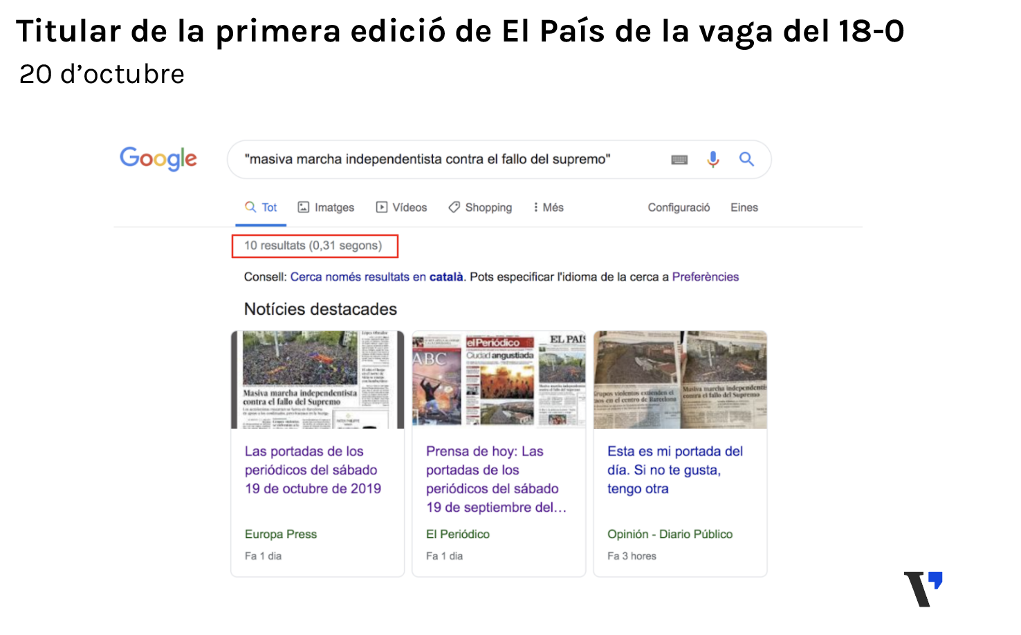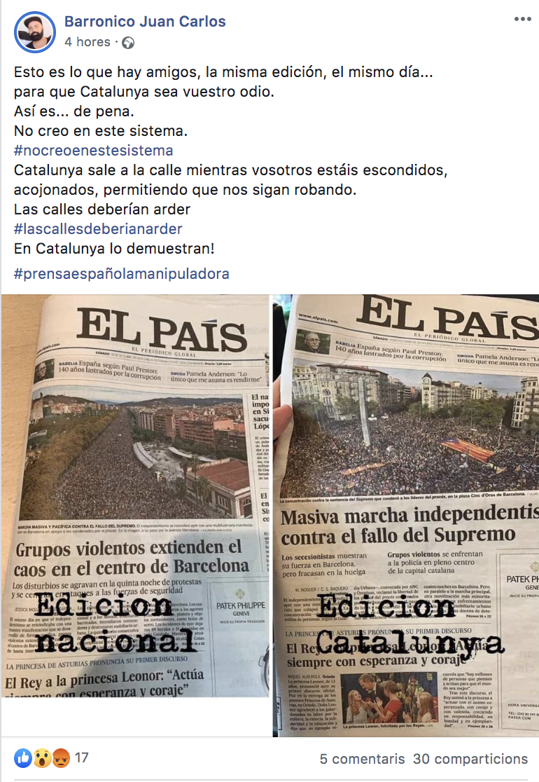 - És fals que el diari El País hagi publicat aquest dissabte 19 d'octubre una portada en paper a Catalunya destacant la "Massiva marxa independentista contra la sentència del Suprem" i una altra a l'edició nacional amb el titular "Grups violents escampen el caos al centre de Barcelona", totes dues referents a la vaga del 18-O a Catalunya. A Catalunya va arribar als quioscos la mateixa edició que es va difondre a Madrid, la de "Grups violents…". La portada de la "Massiva marxa" era una primera edició que va sortir per Europa abans que es produïssin els aladrulls més greus.