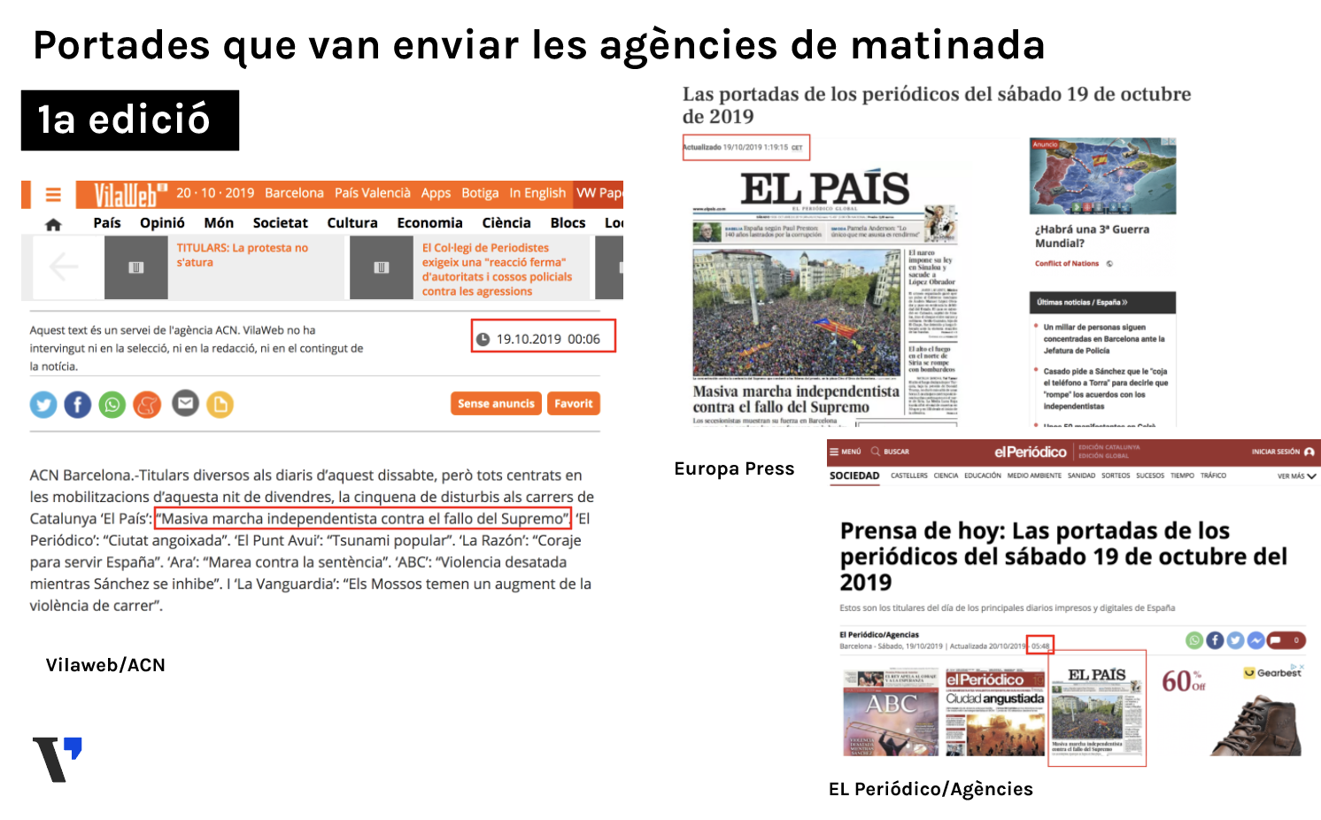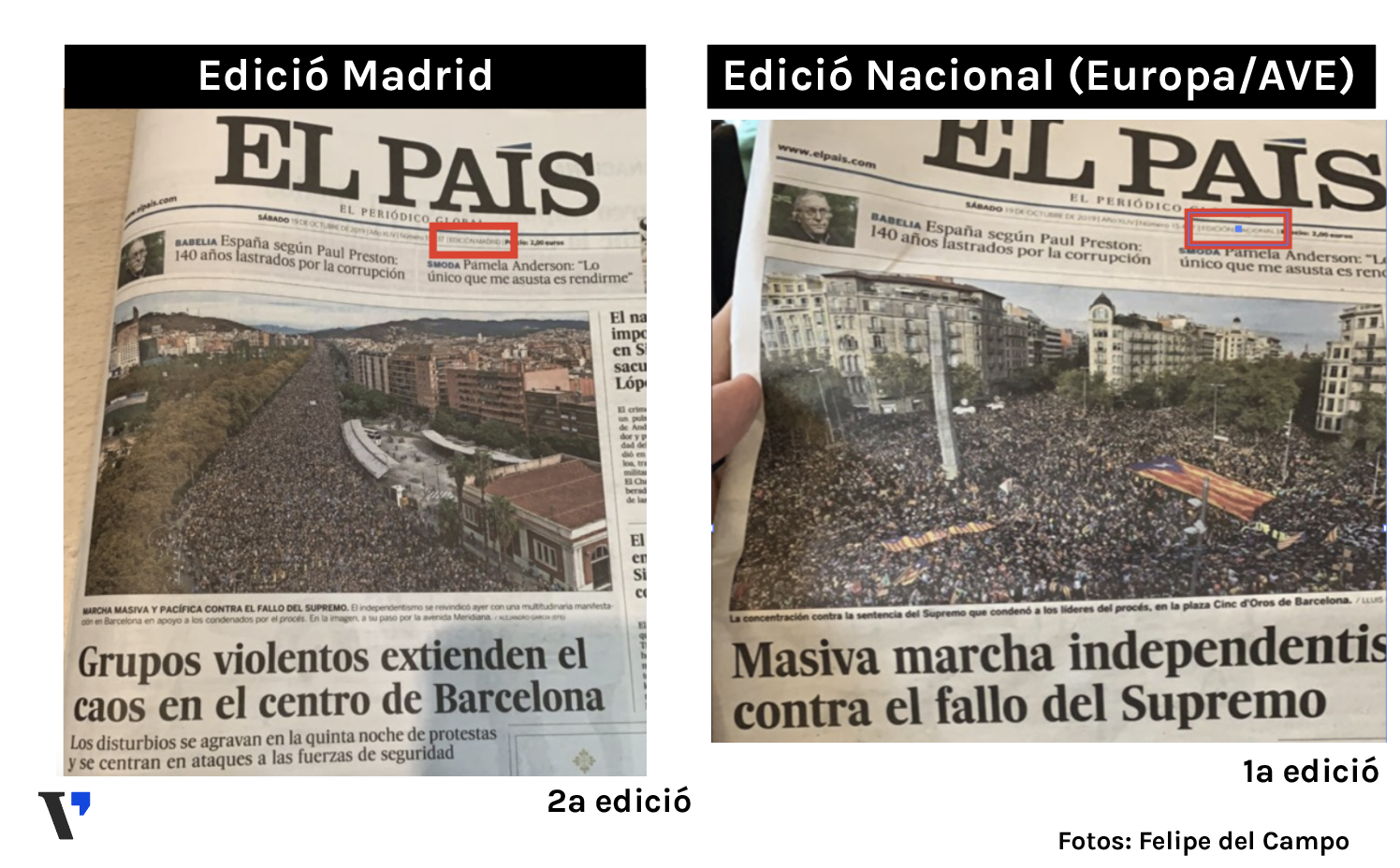 El diumenge va circular de forma viral aquesta fotografia amb dues portades del diari El País assegurant que una era l'edició nacional i l'altra la catalana. Les fotografies feien referència, en realitat, a les dues edicions en diferents horaris que va publicar El País amb data del 19 d’octubre.