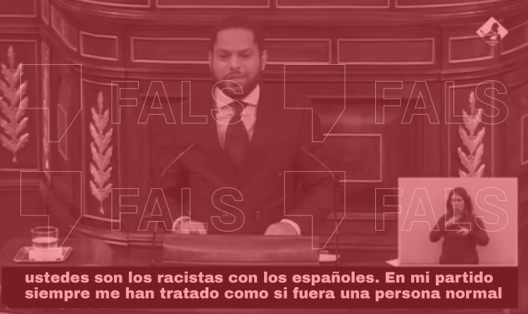 Des del discurs d'Ignacio Garriga a la moció de censura ha circulat una imatge seva al Congrés dels Diputats amb un subtítol que diu "vostès són els racistes amb els espanyols. En el meu partit sempre m'han tractat com si fos una persona normal". És fals, la imatge ha estat manipulada i ha circulat tant en format de mem satíric com prenent les seves paraules seriosament. El vam escoltar i no ho va dir. Revisant el diari de sessions del 21 d'octubre es pot constatar que aquesta frase no va formar part del seu discurs.