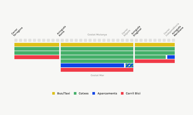 - Finalment, el tram inicial, que va des de la Meridiana fins a la Diagonal, actualment té un carril bus (com a mínim des del 2008) i quatre carrils per automòbils (excepte en el tros de la Meridiana fins al carrer Independència, on hi ha tres carrils per cotxes i una fila d’aparcaments des del 2019). Amb la instal·lació del nou carril bici, quedaran dos carrils pels cotxes fins al carrer Independència i tres carrils des d'allà fins a la Diagonal. Aquesta reducció no es farà en un any perquè, segons els històrics de Google Maps, el tram que va de l’avinguda Meridiana a la Diagonal té carril bus almenys des del 2008.