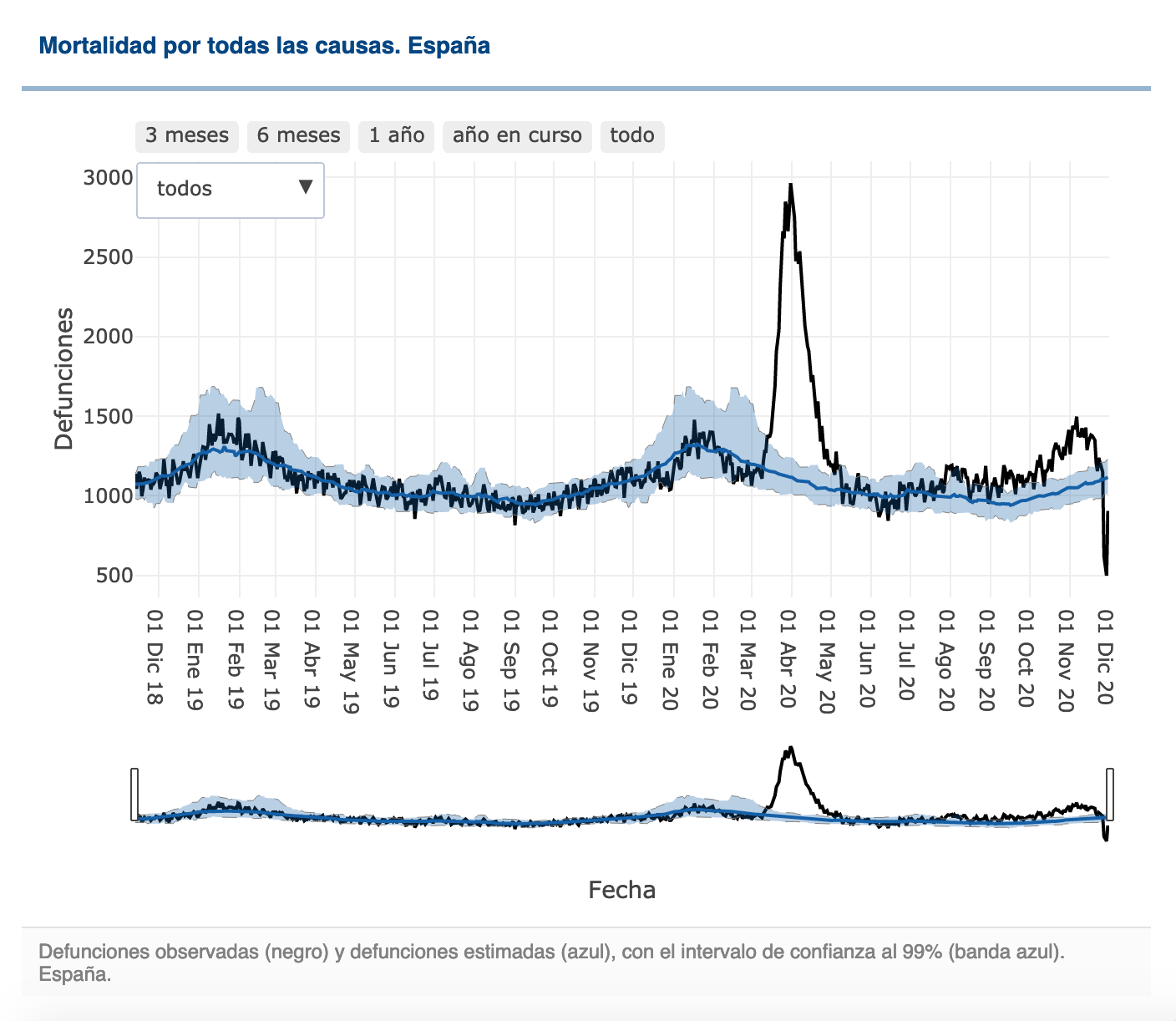 Les dades oficials de defuncions, registrades per l’Institut Nacional d’Estadística, demostren que el 2020 a Espanya han mort 423.790 persones, 66.852 més que el 2019 (en ambdós casos, a la setmana 45 i segons les estimacions oficials). Com demostra l’Institut de Salut Carlos III, del Ministeri de Sanitat, els morts a Espanya han estat durant dos moments del 2020 molt per sobre de la corba esperada, que es calcula amb base a les morts dels anys anteriors. Al gràfic es pot apreciar l’impacte de les dues onades de SARS-CoV-2, en concret, entre el 10 de març i el 9 de maig i entre el 20 de juliol i el 23 de novembre, amb un excés de 44.593 defuncions (66,9%) i 22.012 (17,3%), respectivament. Durant el 2019, d’altra banda, les defuncions registrades coincideixen amb les esperades.
