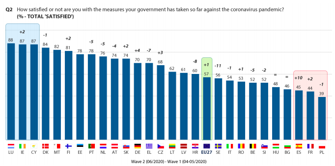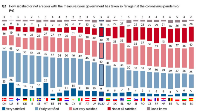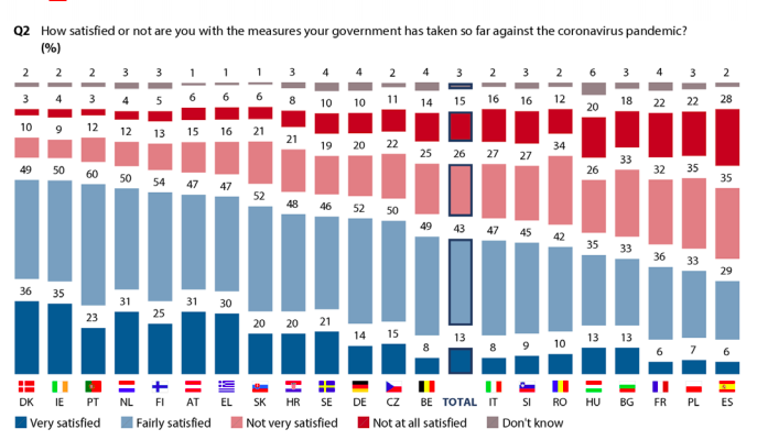 Segons una enquesta realitzada pel Parlament Europeu a finals de l’abril de 2020, els espanyols són els més descontents de la Unió Europea amb la gestió de la pandèmia per part del seu govern estatal: