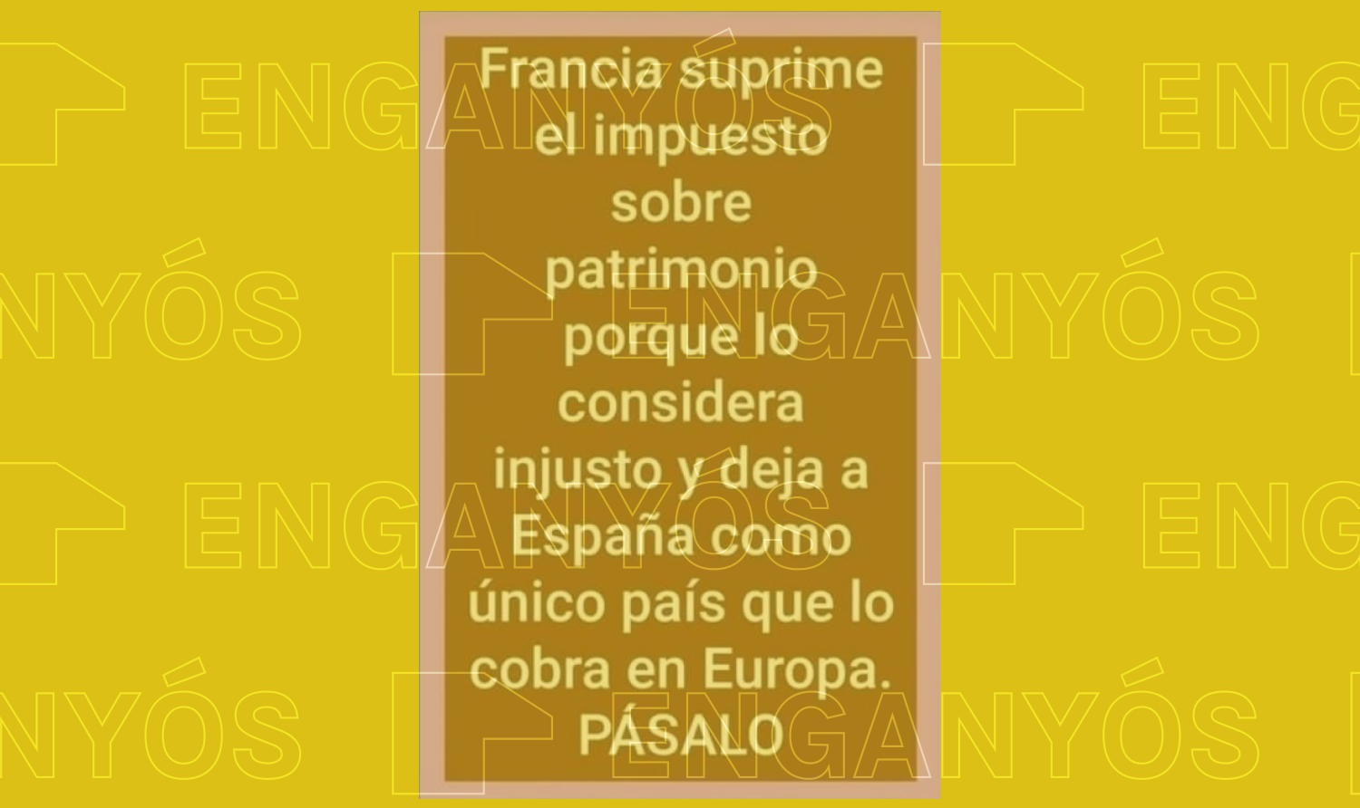Ens heu fet arribar un mem que explica que França ha suprimit l’impost de patrimoni i que ha deixat Espanya com l’únic país d’Europa que l’aplica. És ENGANYÓS. És veritat que França, el 2018, el va modificar, però no el va eliminar del tot i que ja no queda cap altre país de la Unió Europea que el reguli igual que Espanya. A Europa com a continent es manté només a Noruega i Suïssa.