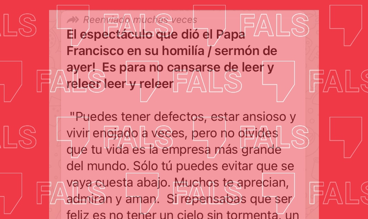 El missatge que s’està compartint pel servei de missatgeria comença advertint els usuaris de "l’espectacle que va donar el papa Francesc en la seva homilia / sermó d’ahir". "És per no cansar-se de llegir-lo i rellegir-lo, llegir-lo i rellegir-lo".