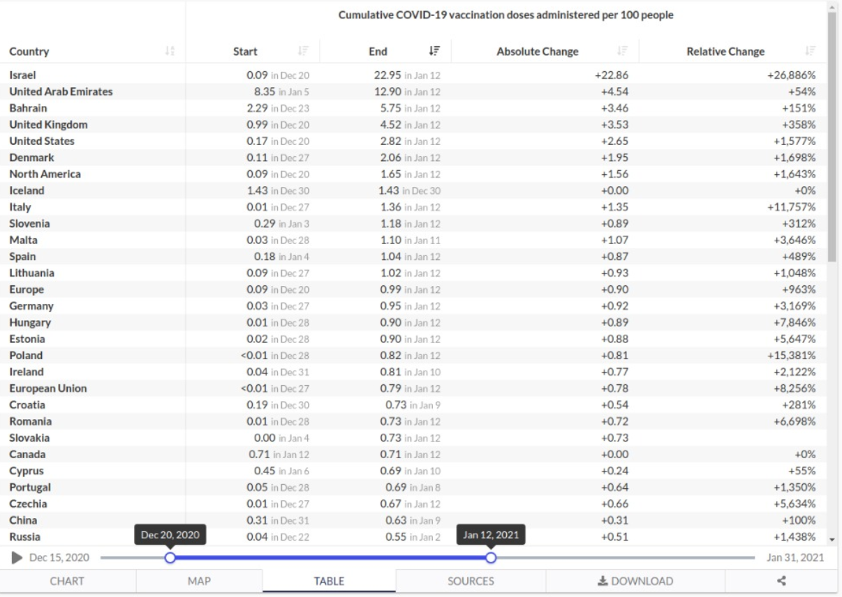 Ara bé, tenint en compte el número de persones vacunades per cada 100.000 habitants, Espanya ocupa el dotzè i el dissetè lloc (a Europa i al món, respectivament), segons les dades que el Financial Times actualitza cada dia amb base a Our World in Data i informació oficial dels respectius governs. En aquest cas, Israel és el país més avançat del món amb un 52,3% de la població vacunada, Emirats Àrabs Units, amb el 34,1% i Regne Unit, 14,2%. Espanya es troba empatada amb Suïssa al 3,1% de la població vacunada.