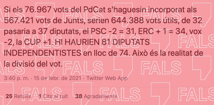 Però no podem afirmar amb tota seguretat que tots els votants del PDeCAT s’haguessin desplaçat a Junts; alguns haurien pogut abstenir-se, altres optar pel PSC o per ERC i alguns (no sabem quants) podrien haver votat, efectivament, per la llista encapçalada per Carles Puigdemont i Laura Borràs. Per tant, és fals que amb els vots del PDeCAT sumats als de Junts els independentistes tindrien 81 escons perquè les matemàtiques ho desmenteixen, però a la vegada el comportament electoral dels votants podria haver estat diferent i és impossible de preveure amb rotunditat.
