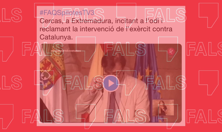 Des de l'aparició de Javier Cercas al programa FAQS de TV3 el dissabte 10 d'abril, circula a Twitter un fragment d'un vídeo de l'escriptor acompanyat d'un missatge que assegura que va demanar la intervenció de l'exèrcit a Catalunya: "Cercas, a Extremadura, incitant a l'odi i reclamant la intervenció de l'exèrcit contra Catalunya". És FALS. Cercas apel·lava a un general, present a l'acte, de la Unitat Militar d'Emergències (UME), un cos que actua en moments de catàstrofes naturals, situacions de risc o calamitats i que no porta a terme lluita armada.