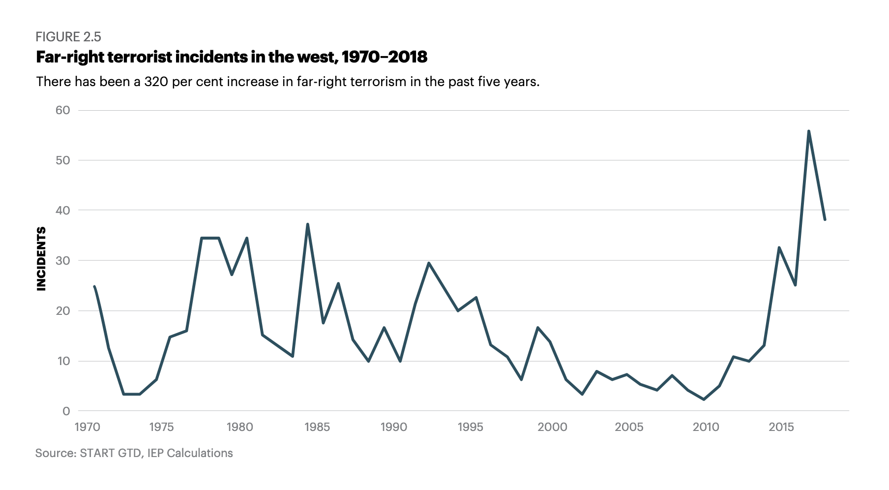 La xifra ve de l'informe Índex de Terrorisme Global corresponent al 2019 de l'Institut per a l'Economia i la Pau (IEP), que assenyala l'augment d'aquest tipus de violència específicament en els últims cinc anys a la regió del món que es considera Occident, i destaca que el 2019 les detencions per aquest tipus d'atacs portaven tres anys a l'alça. L'informe apunta que un 17,2% dels atemptats perpetrats a Occident (com a terme per aglutinar a aquestes l'Amèrica del Nord, Europa Occidental i Oceania) el 2018 van ser a mans de l'extrema dreta, davant del 6,8% a mans d'islamistes, mentre que els atribuïts a l'extrema esquerra, tradicionalment més present, van caure pràcticament a zero. Un 62,8% dels atacs no s'atribueixen a cap grup.