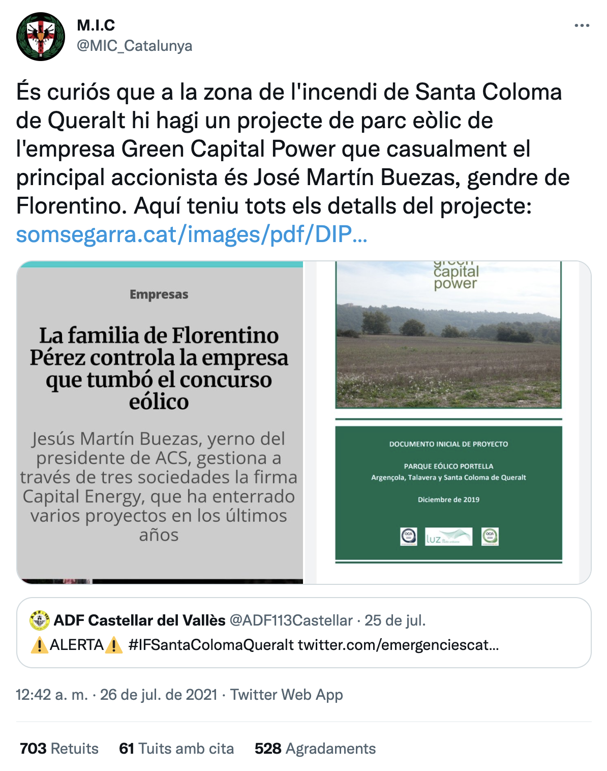 A finals de juliol, els Bombers de la Generalitat van controlar l’incendi que cremava des de feia dies a la Conca de Barberà i l’Anoia, a prop del municipi de Santa Coloma de Queralt. A Twitter, alguns usuaris van insinuar que l’empresa Green Capital Power estava al darrere de l’origen de l’incendi, ja que tenia un parc eòlic projectat en aquella zona, i ens heu preguntat què en sabem.