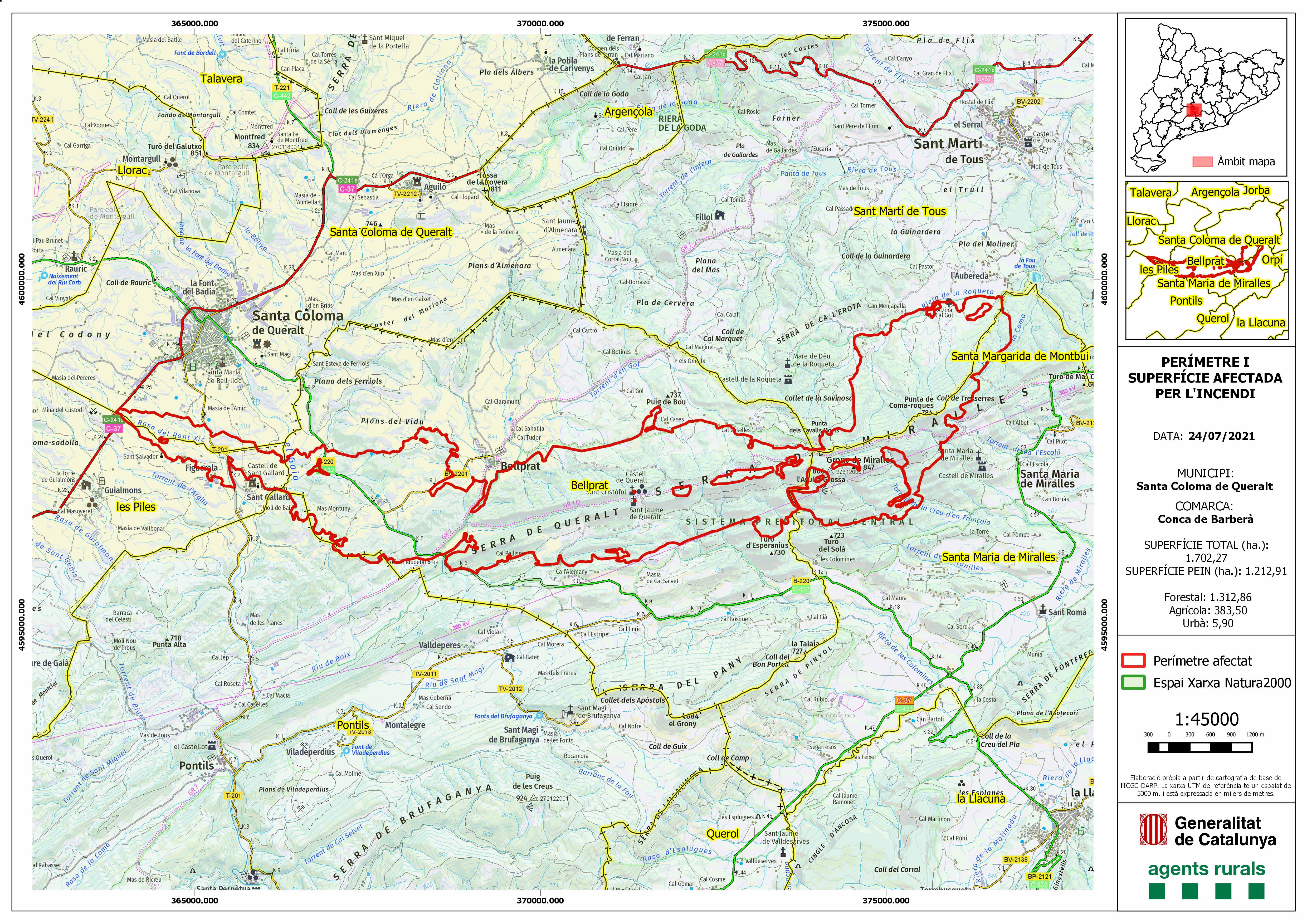 Finalment, el Parc Eòlic Ferriols, format per dotze aerogeneradors, numerats de l’1 al 12 al visor ambiental sí que coincideix, en part, amb la superfície cremada a l’incendi de Santa Coloma de Queralt, mostrada al mapa dels Agents Rurals: