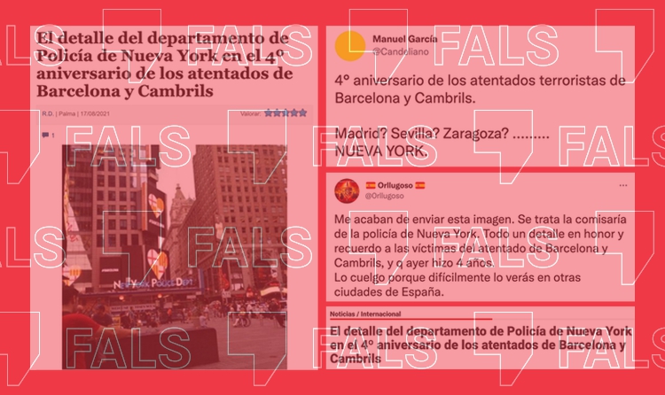 El missatge que circula per WhatsApp afegeix al final que “difícilment” es veurà alguna cosa com la de Nova York “en altres ciutats d’Espanya”. No obstant això, el 2017, de quan data la foto original de Times Square, sí que hi va haver homenatges a diferents municipis espanyols dedicats a les víctimes dels atemptats. A Madrid, per exemple, la font de Cibeles es va il·luminar amb els colors de Barcelona.