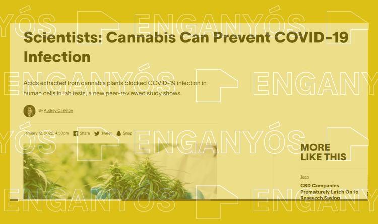 Els titulars enganyosos que no donen els matisos dels estudis científics són una font habitual de desinformació. El cas del cànnabis i la possible reducció d'infeccions per covid-19 n'és un exemple: alguns mitjans han indicat als seus titulars que “el cànnabis pot prevenir la infecció per covid-19”, però la veritat és que el que els científics han observat en els seus estudis, a través d'una tècnica coneguda com a espectrometria de masses de selecció d'afinitat, que certs compostos químics —l'àcid cannabigeròlic (CBGA), l'àcid cannabidiolic (CBDA), i l'àcid tetrahidrocannabinòlic (THCA)— s'uneixen a la proteïna de l'espícula del SARS-CoV-2”, i que els dos primers “poden prevenir l'entrada a la cèl·lula, que és el primer pas en el procés d'infecció”, tal com resumeix a Verificat Richard B. van Breemen, professor de Ciències Farmacèutiques a la Universitat Estatal d'Oregon (EUA), i líder d'aquest estudi publicat a Journal of Natural Products que s'ha fet viral.