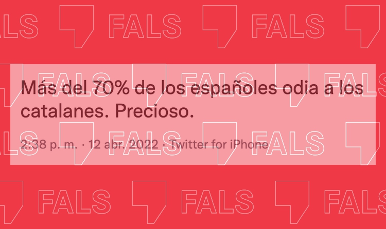 S’ha viralitzat una publicació a Twitter que afirma que “més del 70% dels espanyols odia els catalans”. El tuit es va publicar el mateix dia que es van donar a conèixer els resultats de l’informe Polarització i convivència a Espanya 2021 elaborat per l’Institut Català Internacional per la Pau (ICIP) i el Centre de Polítiques Econòmiques d’Esade (EsadeEcPol).
