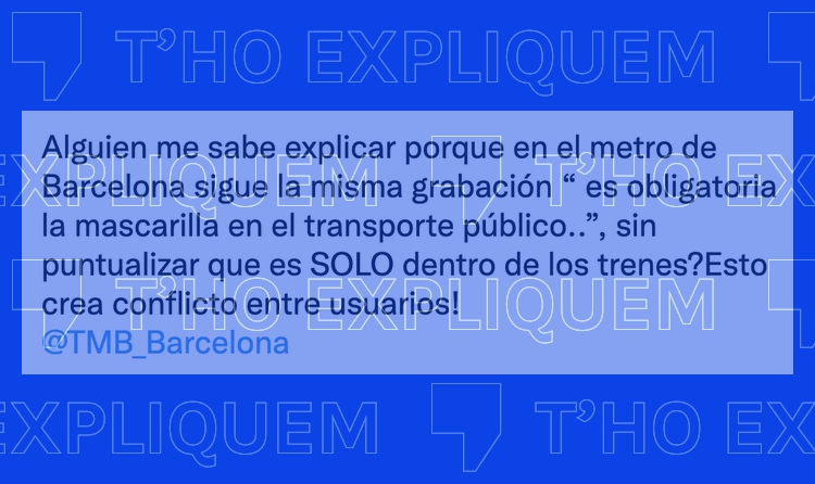 Va ser la resposta d'un usuari la que va motivar que TMB especifiqués que l'ús de la mascareta únicament continua sent obligatori "a l'interior de metro i bus", mentre que "a andanes, passadissos de metro i parades de bus" només "és recomanable dur-la en cas d’aglomeració o quan no es pugui mantenir la distància de seguretat".