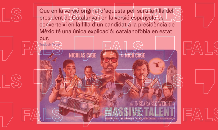 S’han viralitzat tuits que afirmen que mentre a la versió original de la nova pel·lícula protagonitzada per Nicolas Cage, The Unbearable weight of massive talent, apareix la filla del president de Catalunya, a la versió espanyola “es converteix” en la filla d’un candidat a la presidència de Mèxic.