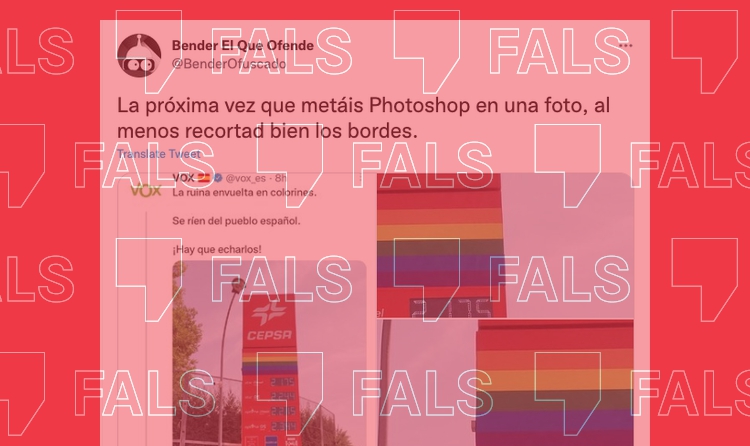 En els darrers dies, s'ha viralitzat un tuit que assegura que una fotografia d'un panell de preus d'una gasolinera Cepsa amb la bandera LGTBI que Vox ha compartit a Twitter és un muntatge (també la va publicar Solidaridad, el seu sindicat). “La pròxima vegada que poseu Photoshop a una foto, almenys retalleu bé les vores”, assenyala el tuit, que el 20 de juny acumula 4.900 retuits i 28.100 m'agrades. En resposta al tuit inicial, el mateix usuari contesta que li han dit “que algunes gasolineres de Cepsa sí que han posat la bandera arc de Sant Martí”, però es mostra igualment “convençut que l'anterior porta Photoshop”.