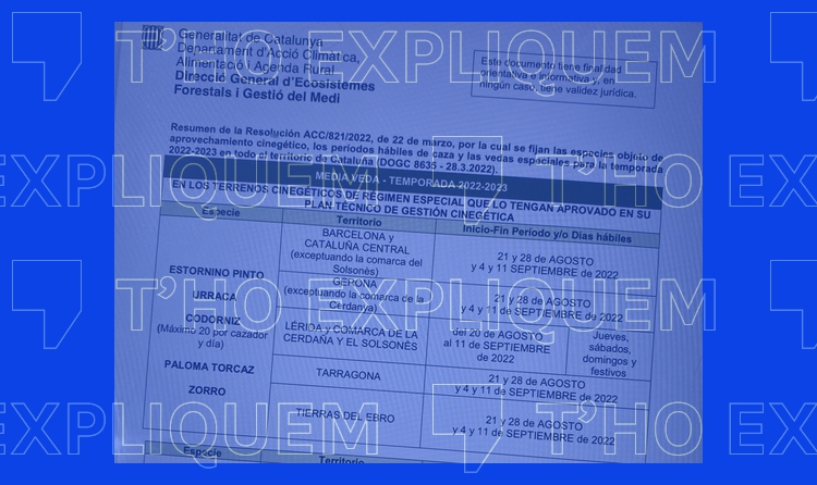 El document que s'ha viralitzat, un resum de la Resolució ACC/821/2022, de 22 de març, per la qual es fixen les espècies objecte d'aprofitament cinegètic, els períodes hàbils de caça i les vedes especials per a la temporada 2022-2023 a tot el territori de Catalunya, està disponible tant en català com en castellà. Així es pot comprovar a la pàgina web del Departament d'Acció Climàtica, Alimentació i Agenda Rural de la Generalitat de Catalunya, l'última data d'actualització de la qual va ser el 28 de març de 2022, tal com s'indica a la cantonada inferior dreta de la pestanya, és a dir, fa més de quatre mesos. La resolució íntegra es va publicar en català i en castellà al Diari Oficial de la Generalitat de Catalunya (DOGC).