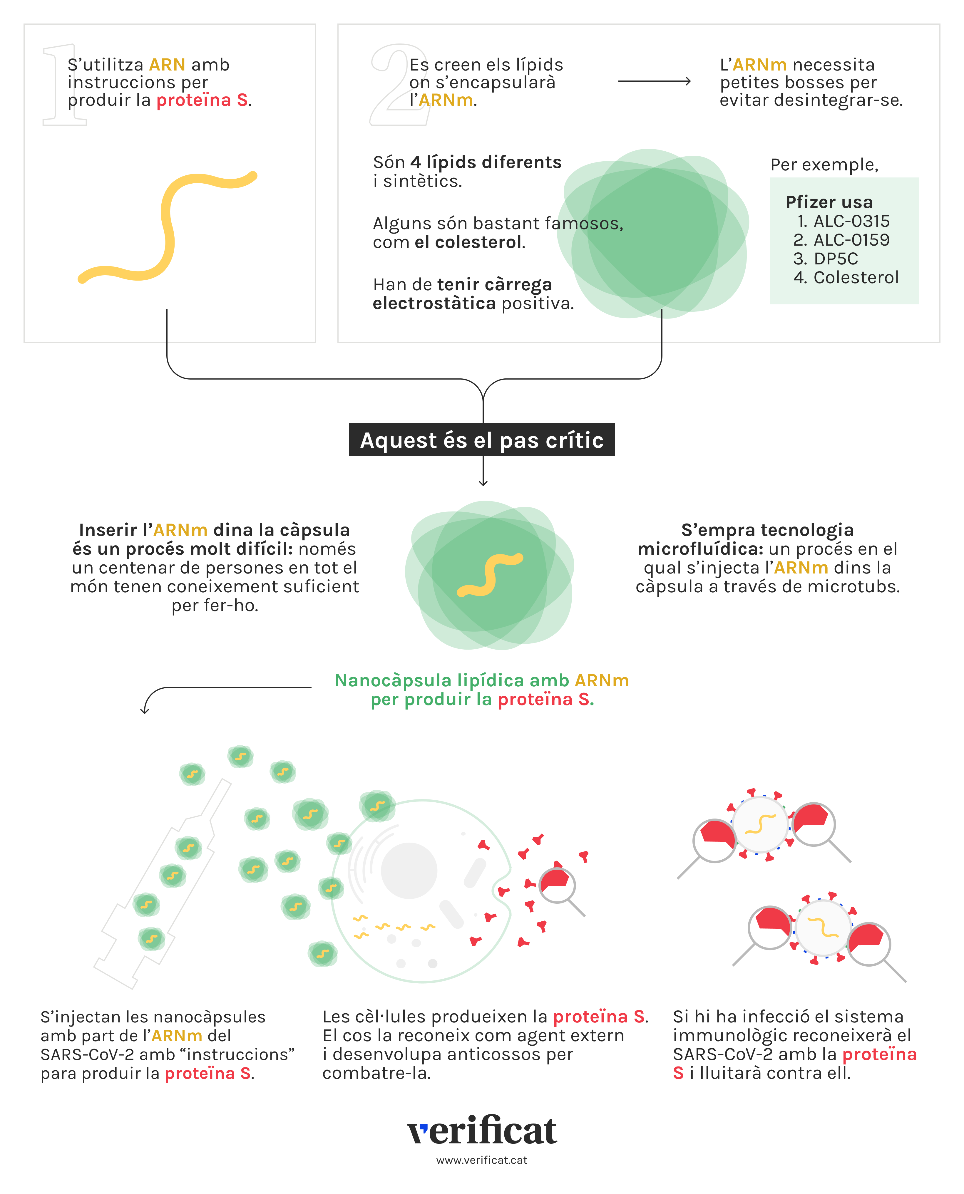 La idea és subministrar el ARN encapsulat en una càpsula lipídica (una mena de bosseta de greix que evita que es destrueixi el contingut), que quan entri dins del cos humà s’alliberarà i permetrà que les cèl·lules pròpies de l’individu produeixin la proteïna S.