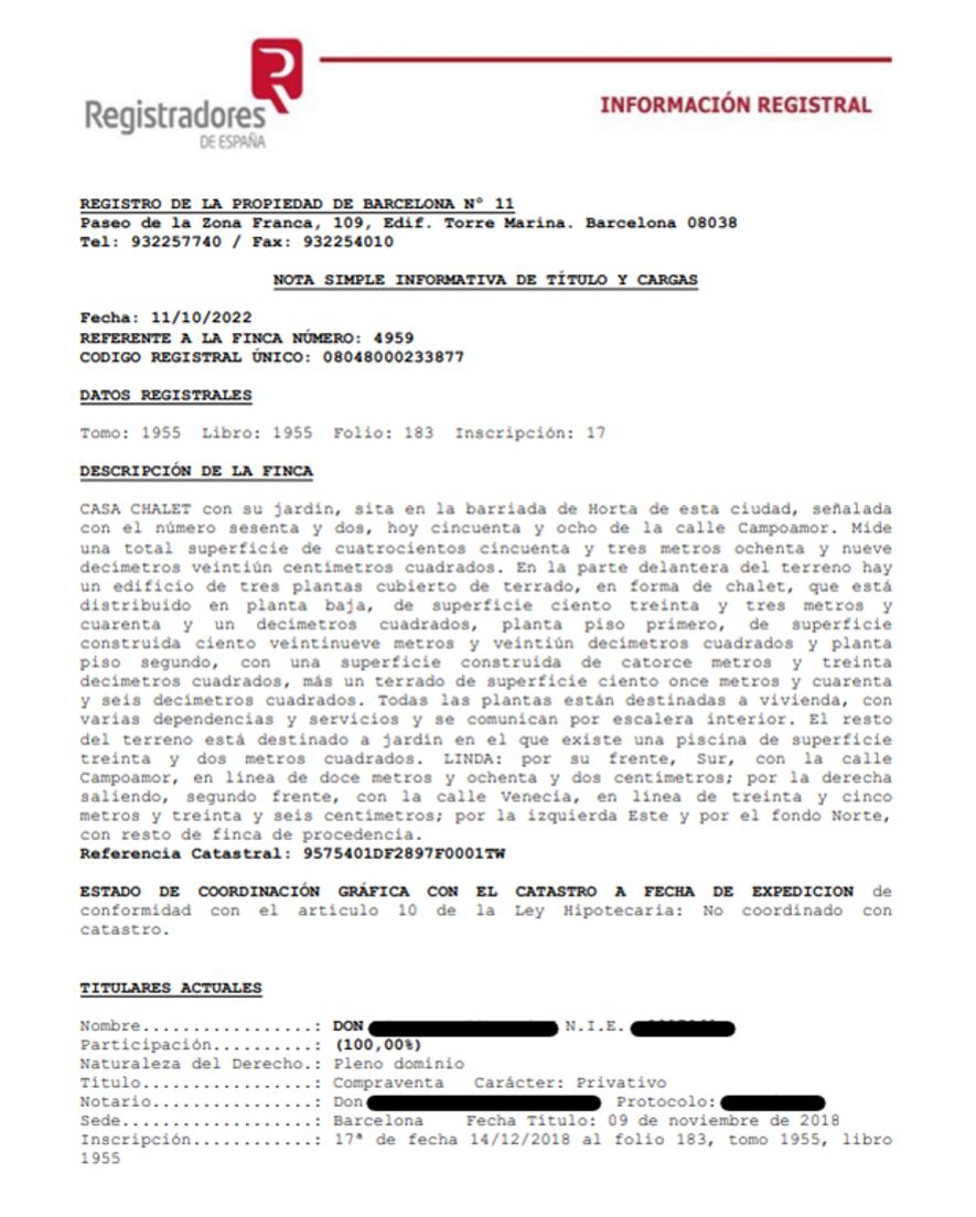 Dades de la propietat del número 58 del carrer Campoamor, al barri d'Horta | Font: Registre de la Propietat de Barcelona