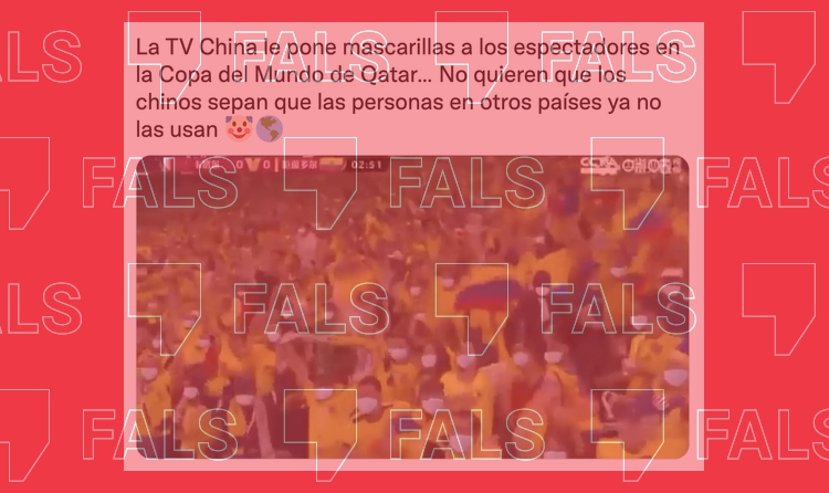 S'ha viralitzat un tuit que assegura que "la TV xinesa li posa mascaretes als espectadors a la Copa del Món" de Qatar perquè "no volen que els xinesos sàpiguen que les persones en altres països ja no les fan servir". La publicació comparteix un vídeo en el qual, suposadament, es pot comprovar que la televisió pública xinesa CCTV va afegir mascaretes de manera digital tant als jugadors com als aficionats durant la retransmissió del partit inaugural del Mundial de Futbol masculí entre Qatar i Equador celebrat el 20 de novembre.