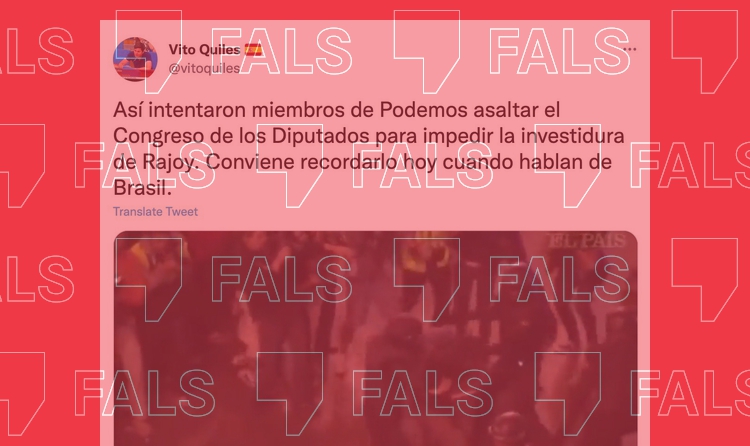 Arran de l'assalt de les seus del poder legislatiu, executiu i judicial del Brasil el passat 8 de gener, s'han viralitzat diversos missatges a les xarxes socials que descontextualitzen un vídeo gravat el 2012 a Espanya. A l'enregistrament es veu un enfrontament entre els participants d'una manifestació al voltant del Congrés dels Diputats a Madrid i els cossos de seguretat. Algunes publicacions de Twitter afirmen que són membres de Podemos que van intentar assaltar l'hemicicle per impedir la investidura de Mariano Rajoy.
