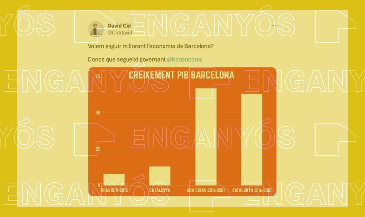 El diputat d'En Comú Podem al Parlament de Catalunya David Cid va publicar a Twitter un gràfic sota el títol “creixement PIB Barcelona” que mostrava que el producte interior brut (PIB) de Barcelona ha augmentat més que el de Catalunya durant sis dels vuit anys del mandat d’Ada Colau (2016-2021, ambdós inclosos), i més que el de la mateixa capital catalana durant el govern del seu predecessor, Xavier Trias, actual candidat de Junts per Catalunya a l’alcaldia. El gràfic xifrava el creixement de Barcelona de 2016 a 2021 prop d’un “75” i situava el creixement de la ciutat de 2011 a 2015 per sota d’un “25” sense especificar la unitat de mesura ni la font que feia servir.