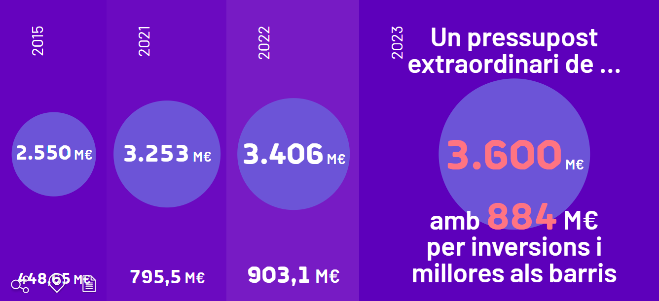 L’Ajuntament de Barcelona ha publicat un portal interactiu que repassa les actuacions del consistori entre el 2019 i el 2023, durant el mandat en coalició entre Barcelona en Comú i el PSC. La primera dada que mostra és l’augment del pressupost municipal entre el 2015 i el 2023, il·lustrat amb uns cercles la mida dels quals incrementa amb els anys.