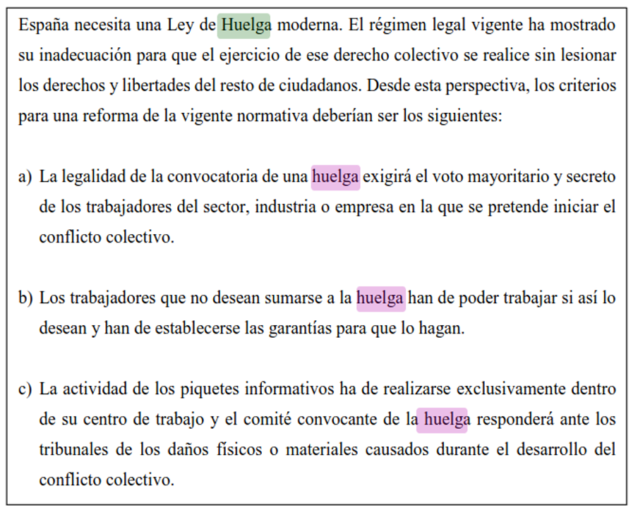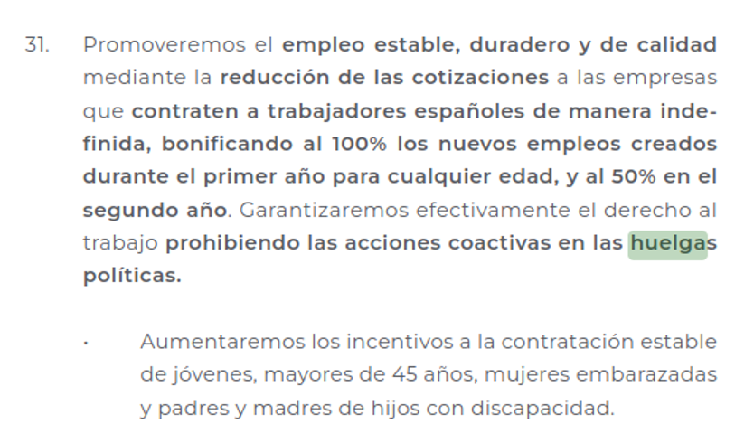 En el punt 44 també es proposa una llei "per a la protecció dels drets constitucionals dels treballadors" i una reforma del Codi Penal que castigui "els piquets de vaga".