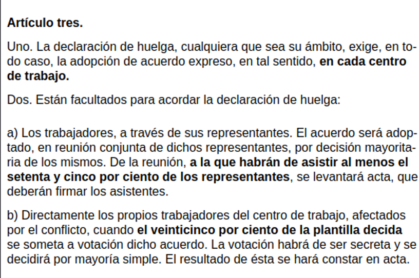 Aquesta exigència del vot majoritari dels treballadors del sector, indústria o empresa seria una limitació respecte al dret a vaga actual ja que, segons l'article 3 del Reial decret llei 17/1977 sobre relacions de treball que ho recull, la declaració d'una vaga pot acordar-se per acord de la majoria dels representants dels treballadors (no del conjunt de la plantilla).