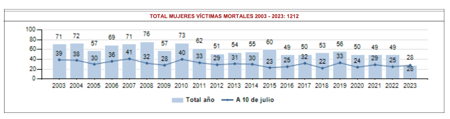 El 2019 es van produir 56 assassinats i el 2022 va acabar amb 49 víctimes mortals a mans de la seva parella o exparella, segons les xifres publicades pel Ministeri d'Igualtat. Aquest 2023, fins al 10 de juliol, s'han produït 28 assassinats (en el mateix període del 2019, van ser assassinades 33 i el 2018, 22).
