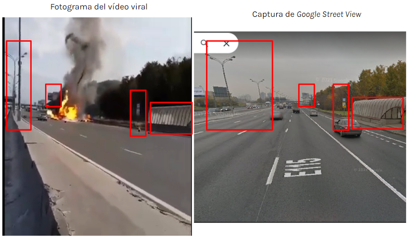 Una cerca del primer quilòmetre de la carretera de circumval·lació de Moscou (en rus, 1-м километре МКАД) a Google Maps també permet ubicar el lloc de l’accident al mapa amb imatges de 2014, on es veuen els mateixos detalls que al vídeo viral.